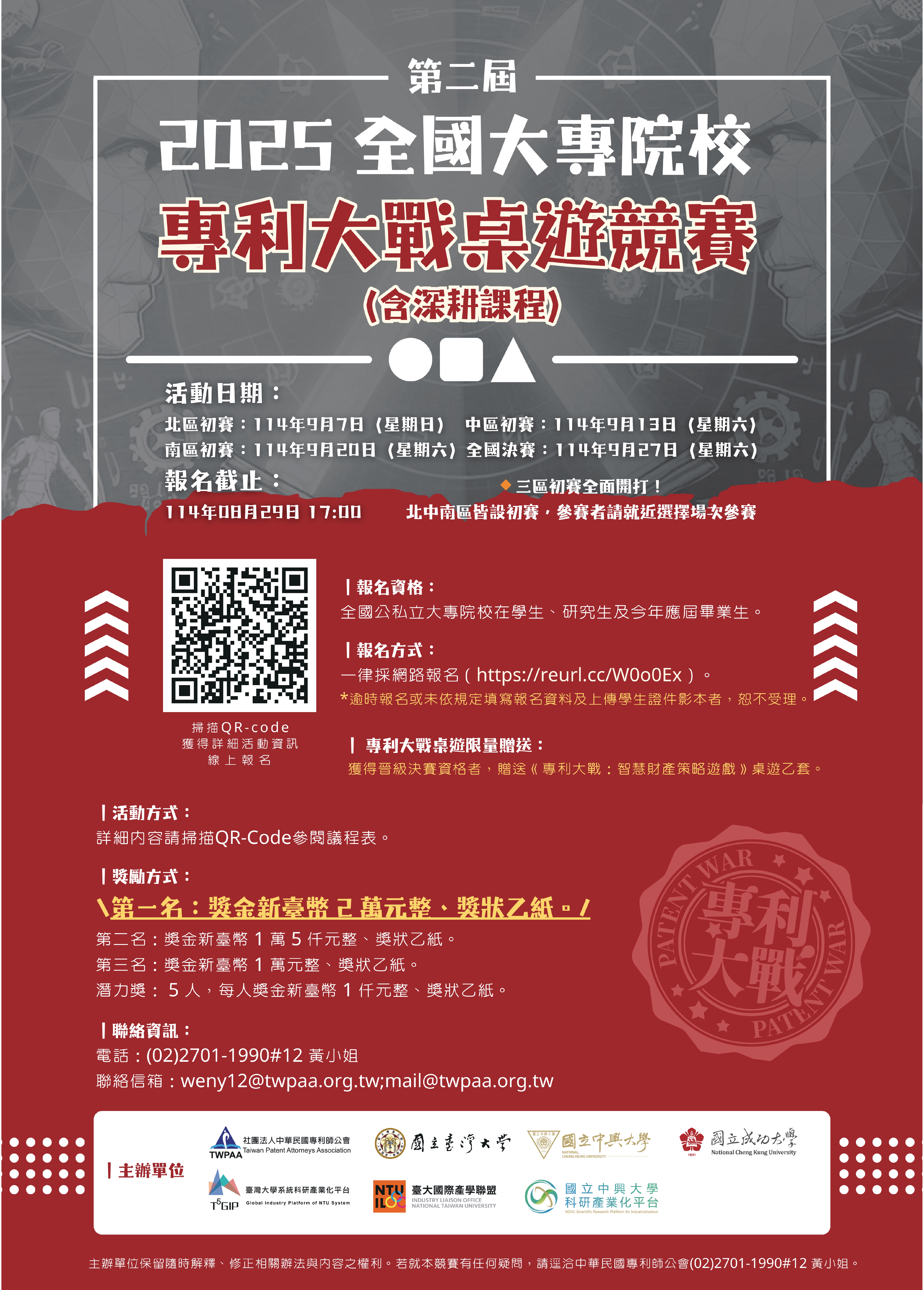 一、本會為推廣專利知識,特聯合國立臺灣大學、中興大學、成功大學,共同舉辦「第二屆全國大專院校專利大戰桌遊競賽(含深耕課程)」,期能啟發學生的發明創造力,並為國家培育優秀的專利人才,提升我國科技產業之競爭力。