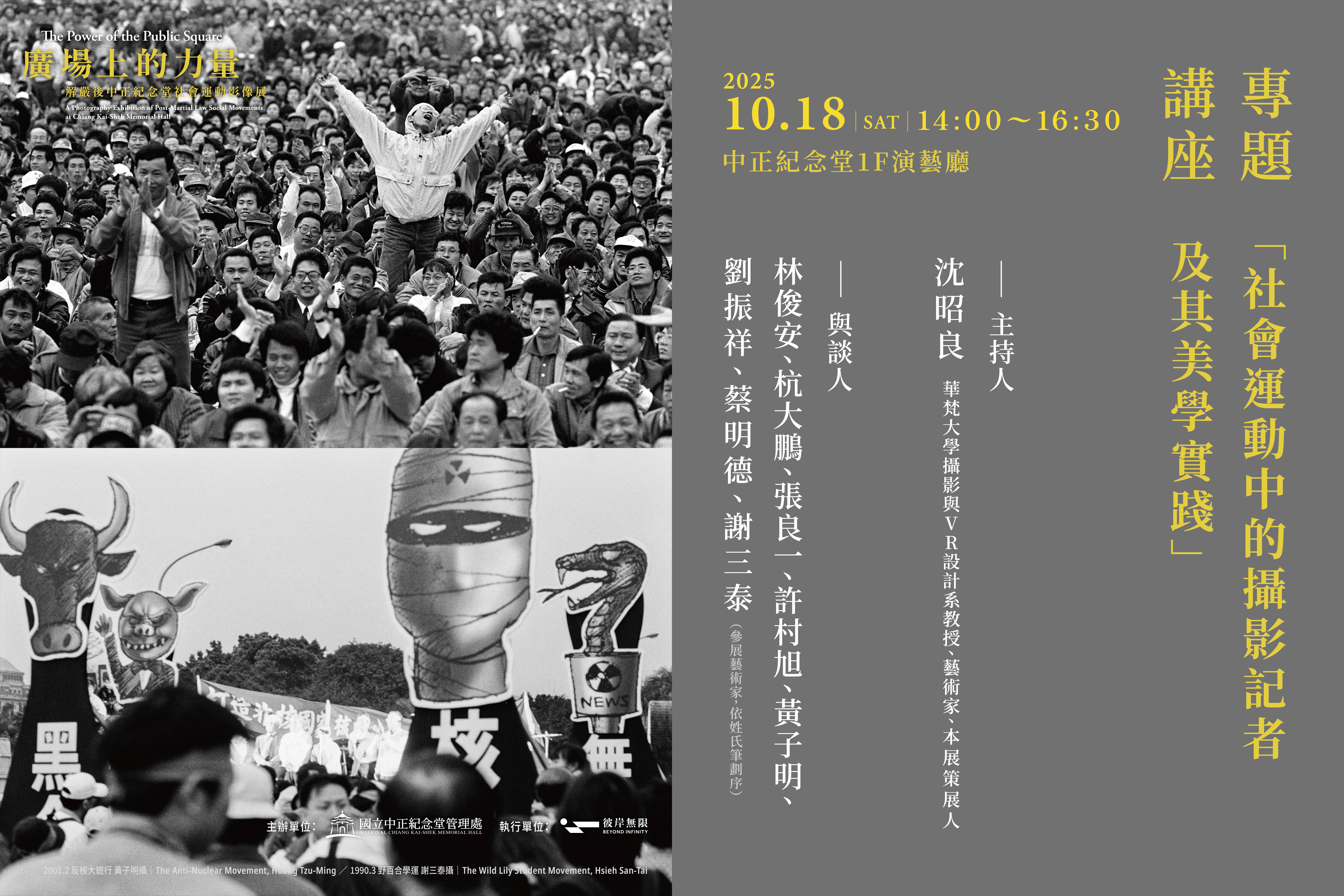 一、中正紀念堂一樓藝廊刻正展出「廣場上的力量—解嚴後中正紀念 堂社會運動影像展」(展期為114年9月4日至11月5日), 由華梵大學攝影與VR設計系沈昭良教授擔任策展人,邀請包括蔡明德、劉振祥、謝三泰、黃子明、許村旭、林俊安、許伯鑫、連慧玲、張良一、杭大鵬、陳宗怡、曾原信及趙世勳共13位媒體及攝影工作者參與展出。從上萬張影像照片中,選出111張在中正紀念堂廣場發生的二十多場社運現場所拍攝的攝影作品,呈現跨世代及跨時代的臺灣精采多元民主聲音。