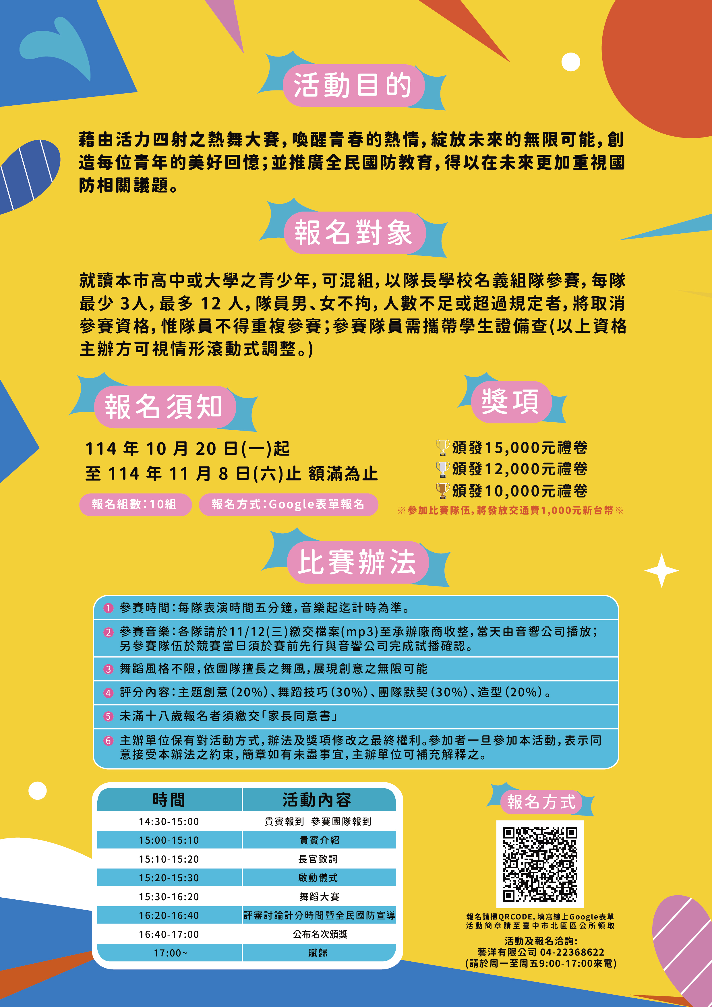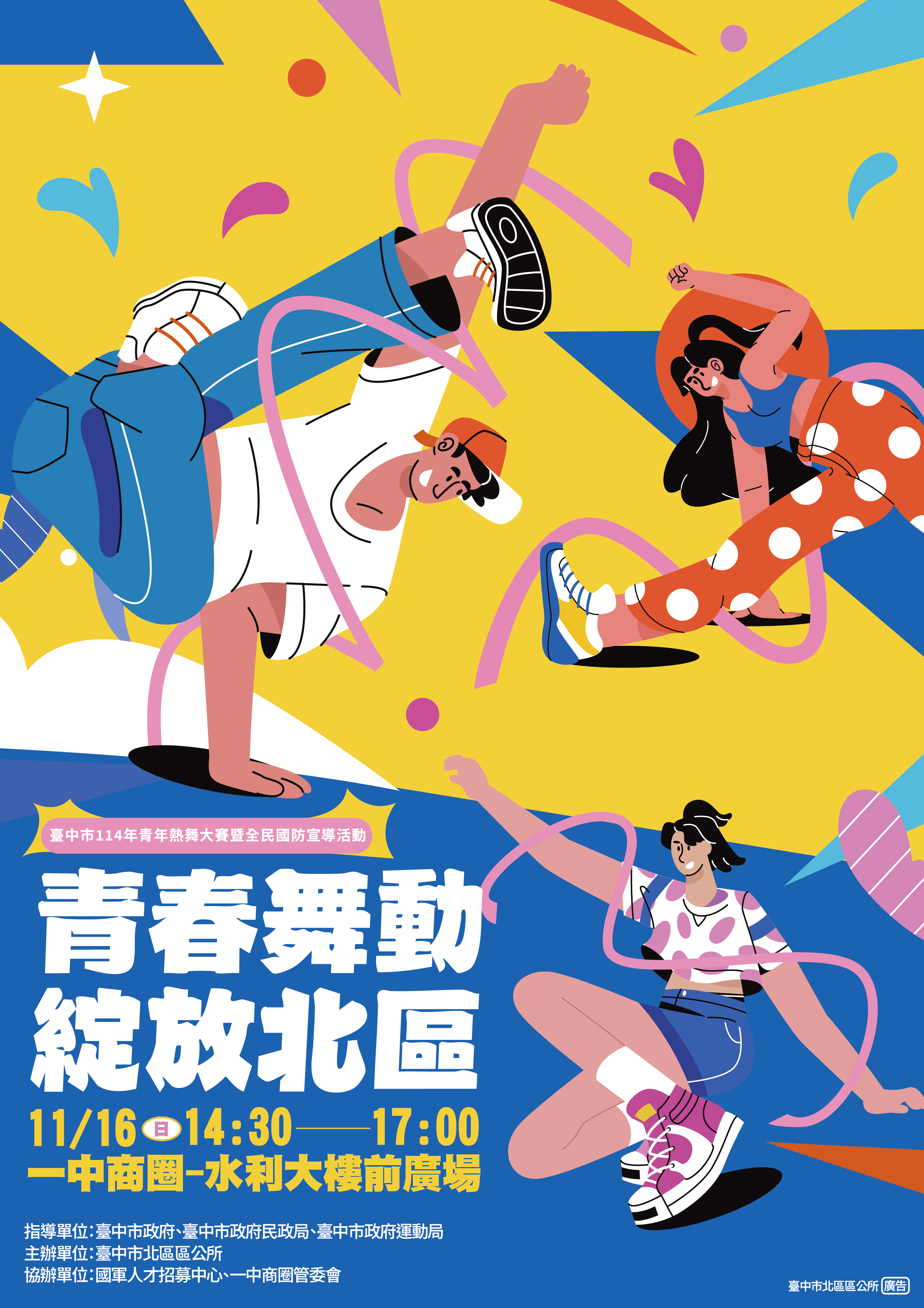 一、為鼓勵青少年投入正當休閒運動活動,透過熱舞調劑身心與培養運動精神,並藉機向大眾宣導全民國防之重要,因而舉辦「臺中市114年青年熱舞大賽暨全民國防宣導活動」,活動訂於114年11月16日(星期日)下午2時30分至5時於臺中市一中商圈水利大樓前廣場(臺中市北區尊賢街7號)舉辦。