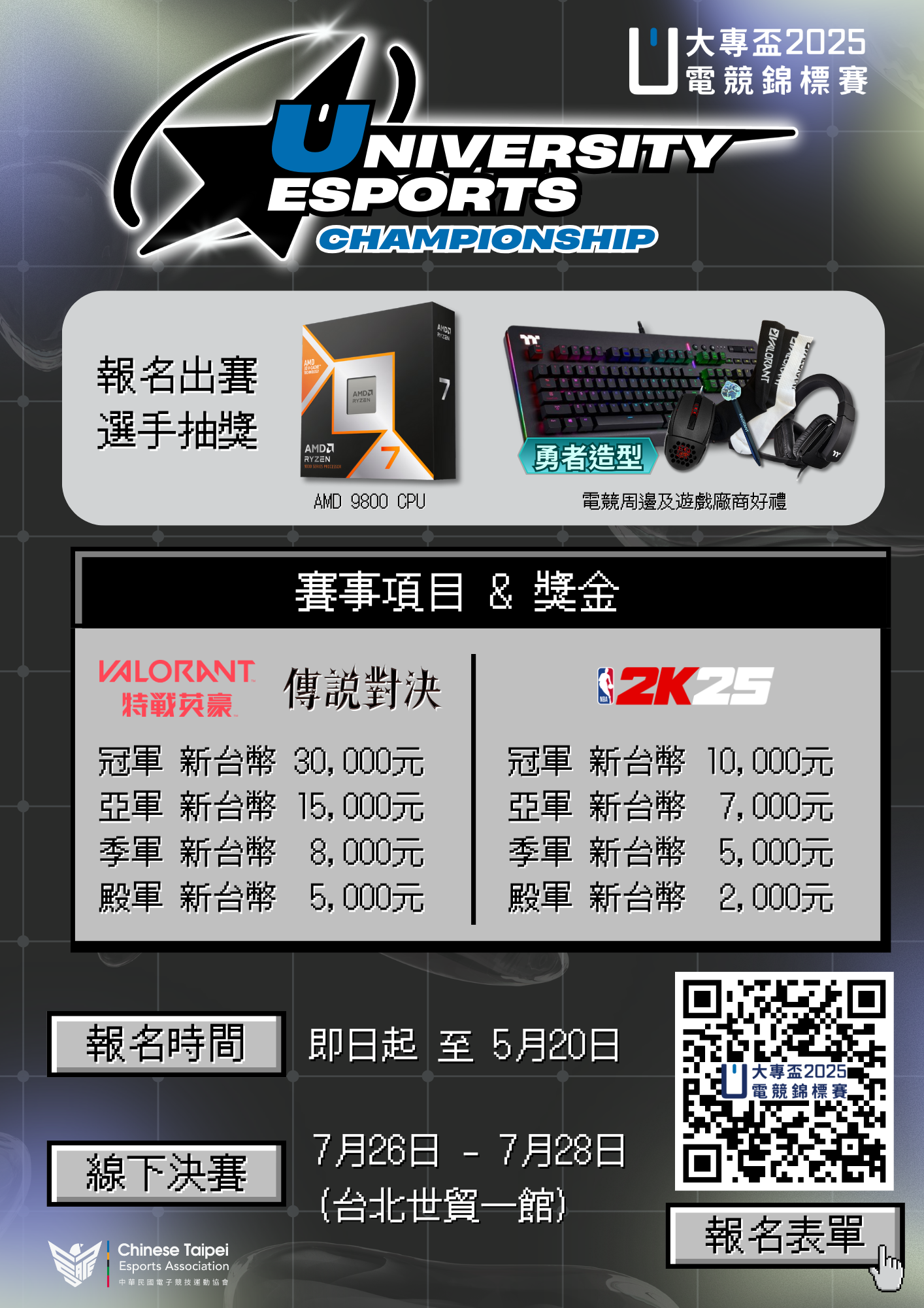 (四)賽事項目:NBA 2K25(個人)、傳說對決(團體)、特戰英豪(團體)。