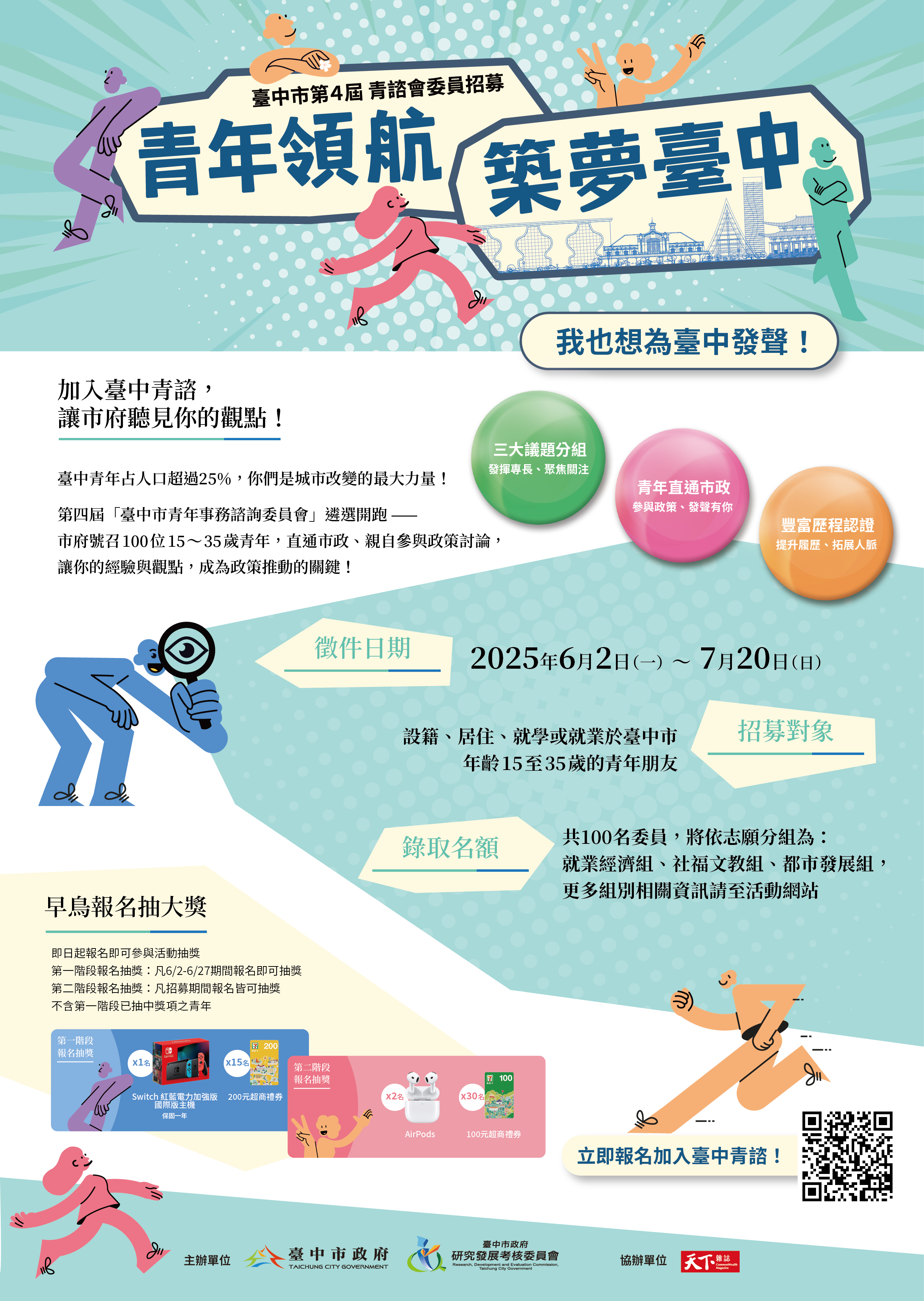 三、為聽取更多不同領域之青年意見,第四屆臺中青諮會議題小組分設就業經濟組、社福文教組及都市發展組,青年參與議題範疇更廣泛且多元,報名資訊說明如下: