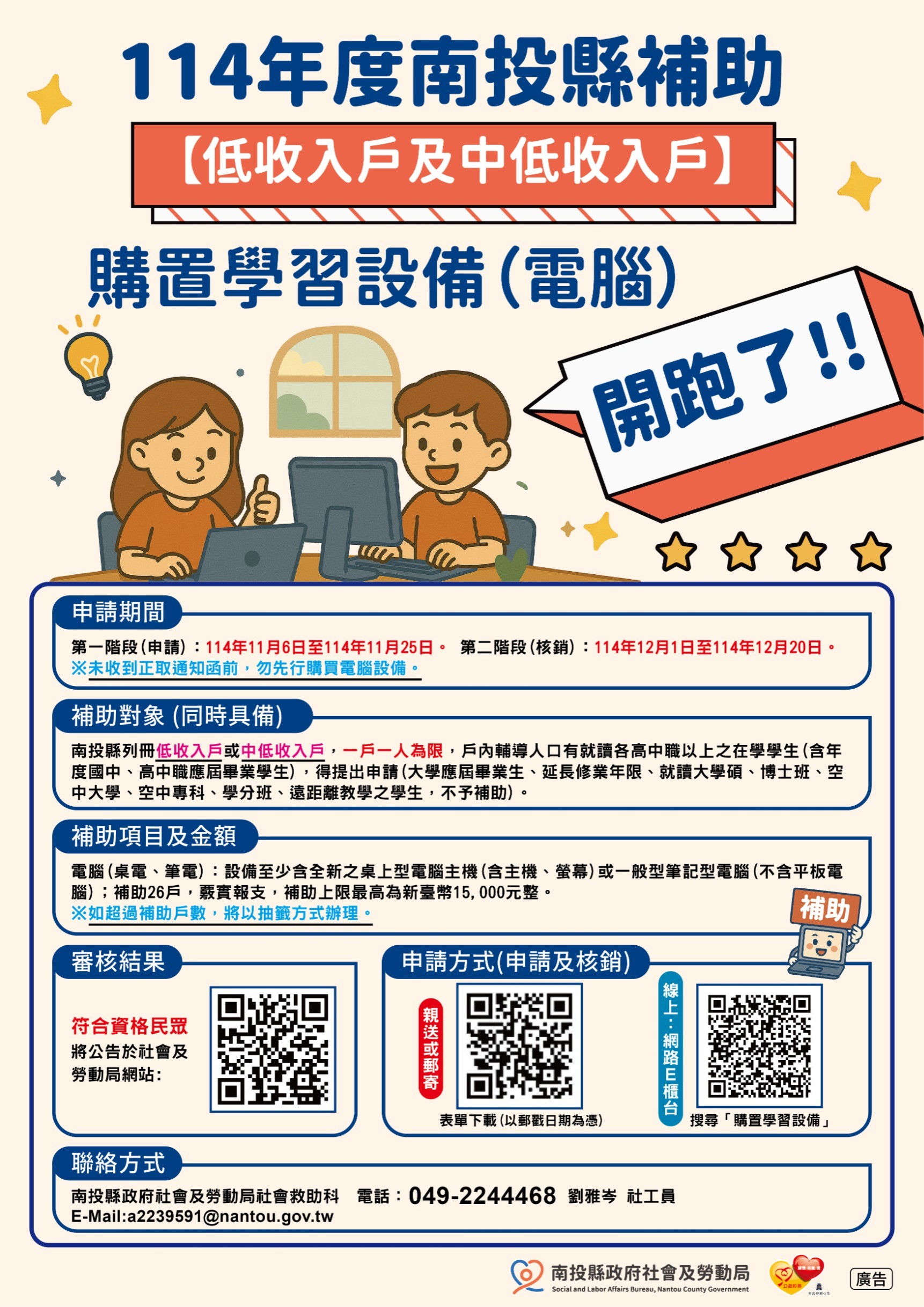申請辦法:請自行下載並填妥申請表及相關證明文件向該單位申請。 截止日期:114年11月25日。