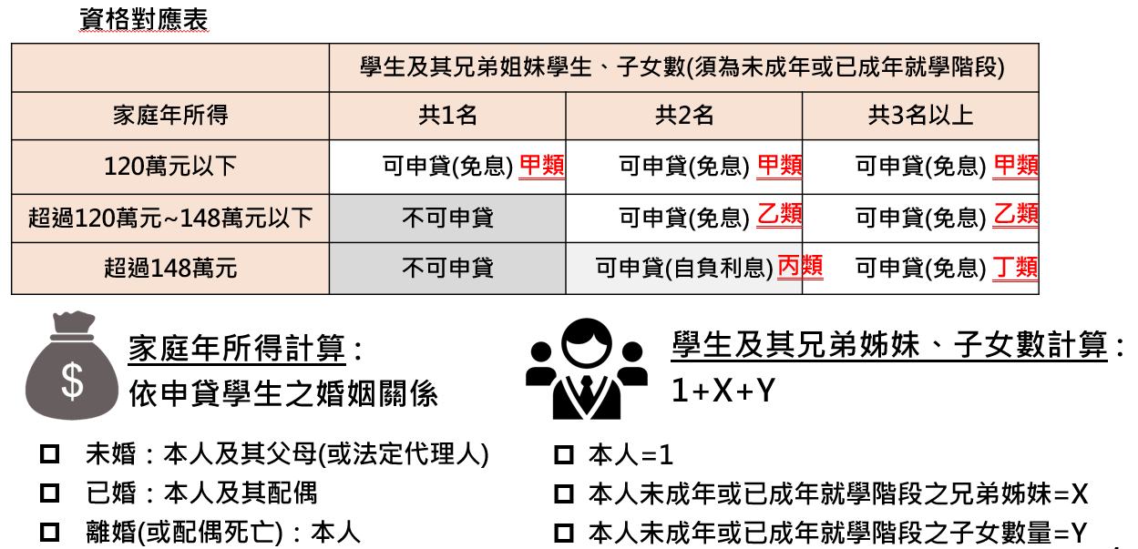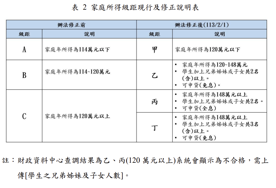 一、依據教育部高級中等以上學校學生就學貸款辦法第7及8條及配合教育部「拉近公私立學校學雜費差距及其配套措施方案」辦理,自112學年度第2學期起,就學貸款申貸門檻由120萬調整至148萬,並新增計列兄弟姊妹及子女數,以判定申貸資格是否符合及各級距利息補貼。
